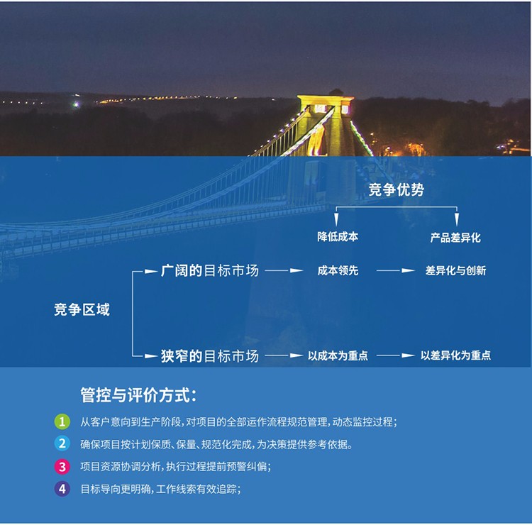 产品战略包含:产品策划、研发、项目管理、费用管理、资源匹配与预警,产品生命周期管理、结果反馈与评价。