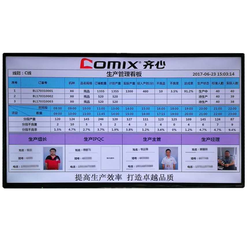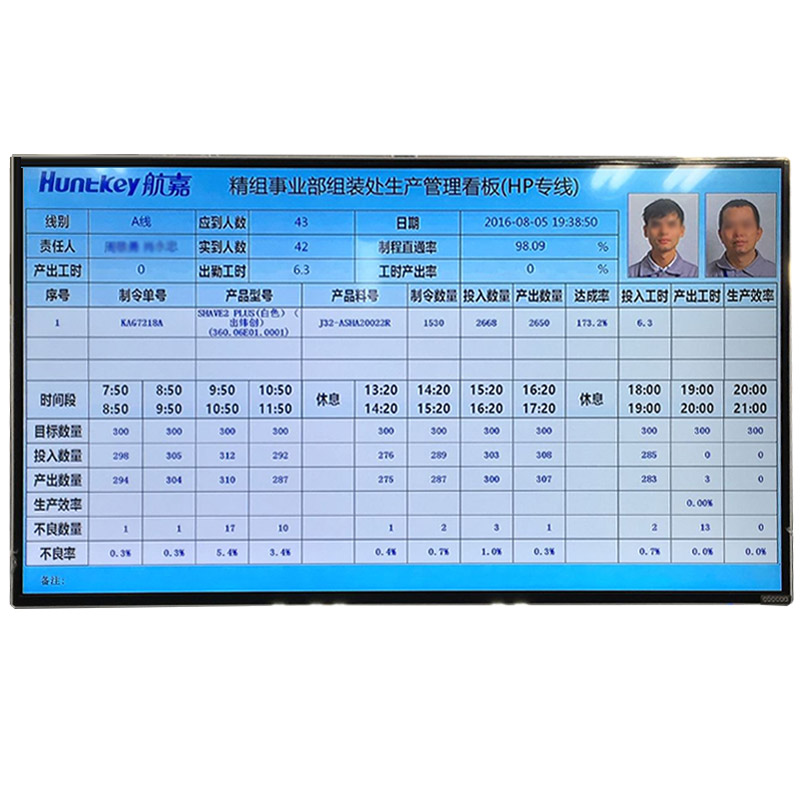 液晶电子看板,采用高分辨率,显示内容丰富,色彩和布局可根据客户喜好进行设计,同时可通过以太网/无线网络将工厂内的所有电子看板进行集中管理,并且将实时的生产数据上传到服务器,管理人员在办公室就可以实时查看生产进度,返修率等数据。
